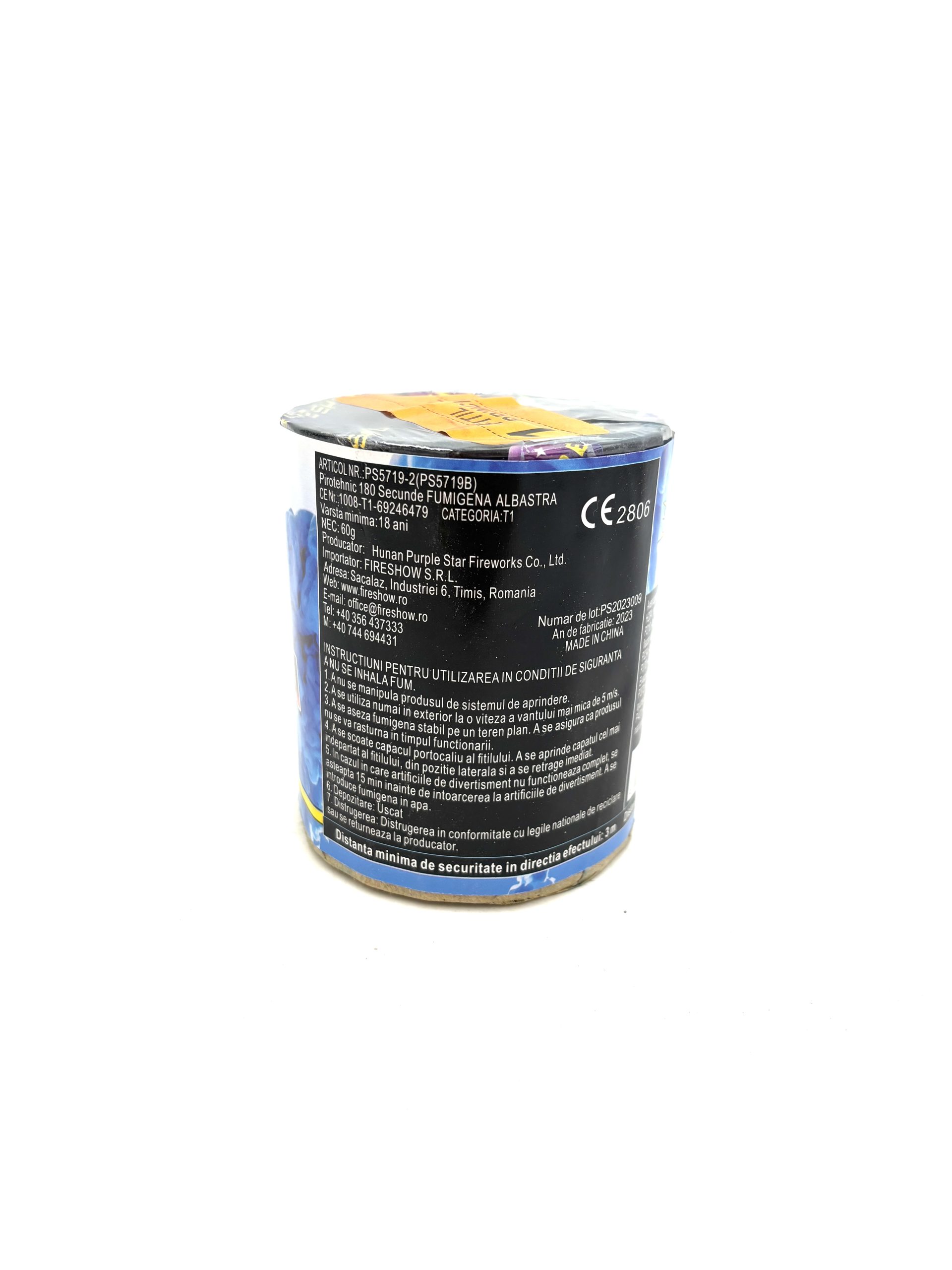 Fumigenă colorată (roșu, galben, albastru), durată ~180 secunde. Categorie T1 – utilizare în exterior. Creează un efect intens de fum, ideal pentru evenimente, filmări și sesiuni foto. Conținut 60 g. Vârsta minimă: 18+.