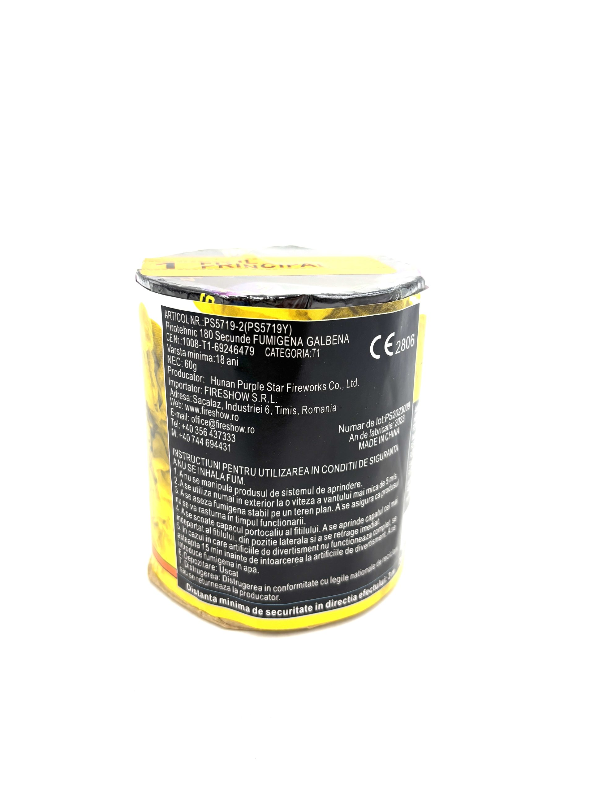 Fumigenă colorată (roșu, galben, albastru), durată ~180 secunde. Categorie T1 – utilizare în exterior. Creează un efect intens de fum, ideal pentru evenimente, filmări și sesiuni foto. Conținut 60 g. Vârsta minimă: 18+.